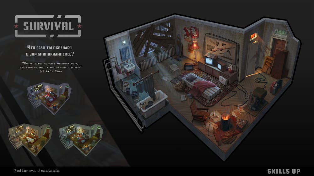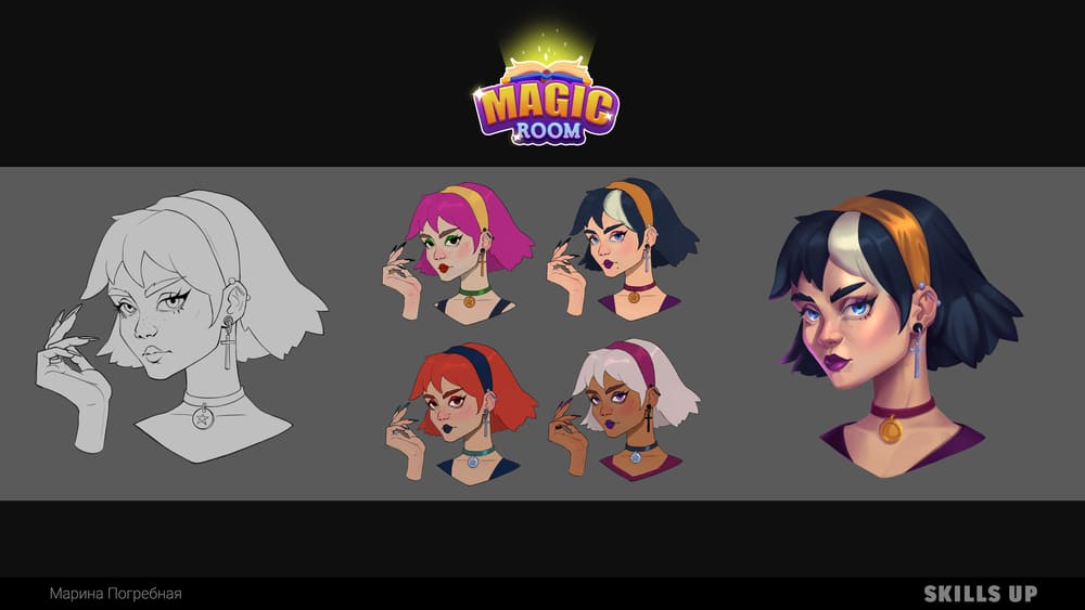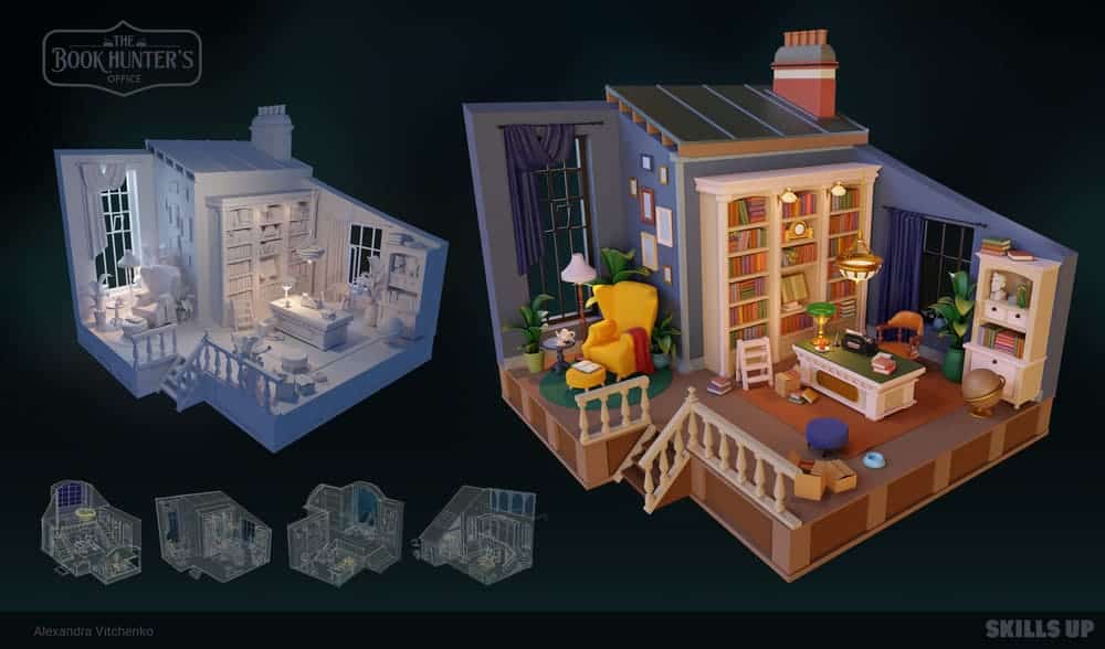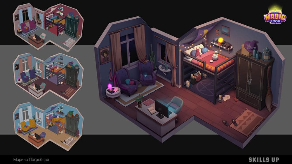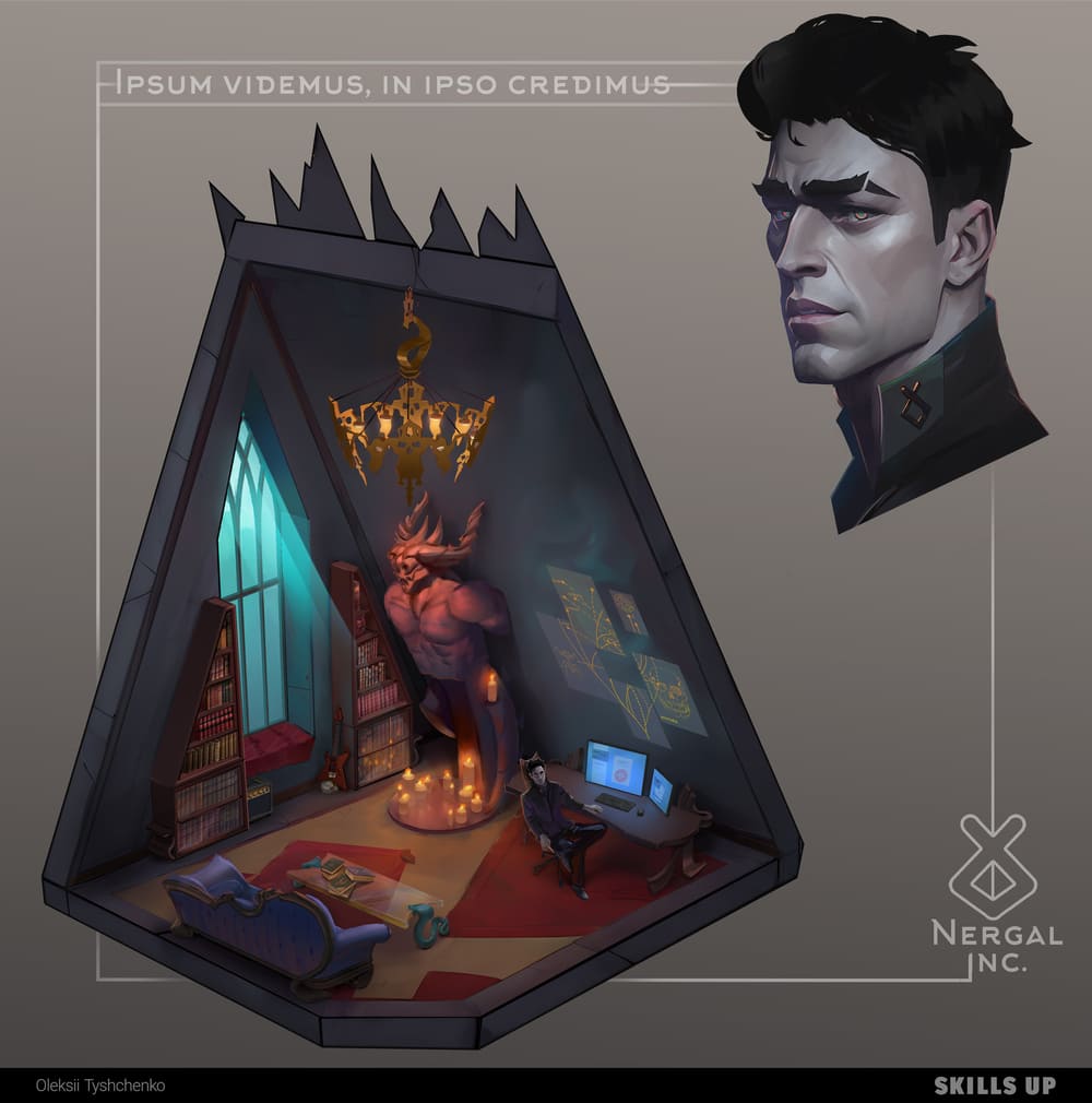 On the course, you will create a major project united by a common idea. The first part is the concept of an interior in the chosen setting. You will work with the design of interior objects, color combinations, lighting, and storytelling, study techniques for rendering locations. The second part is a portrait of the character who owns the room (room, office, study, etc.). You will study the structure of the head, work with styling, the character's personality, details of the image, and skin rendering. In the final, you will create a project logo and design it for your portfolio.