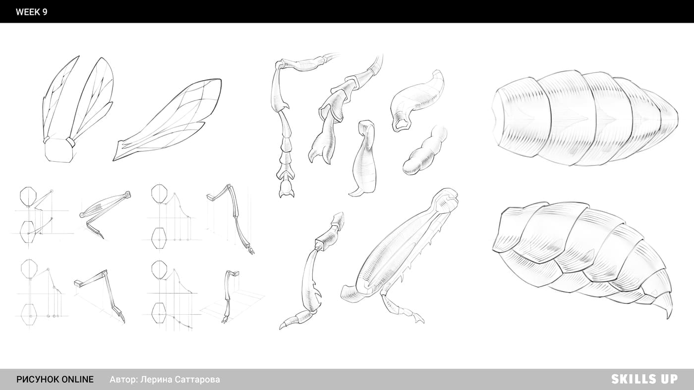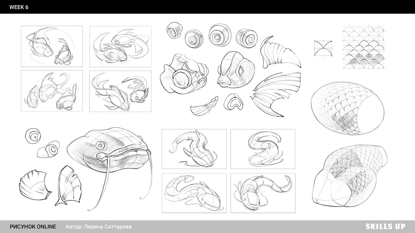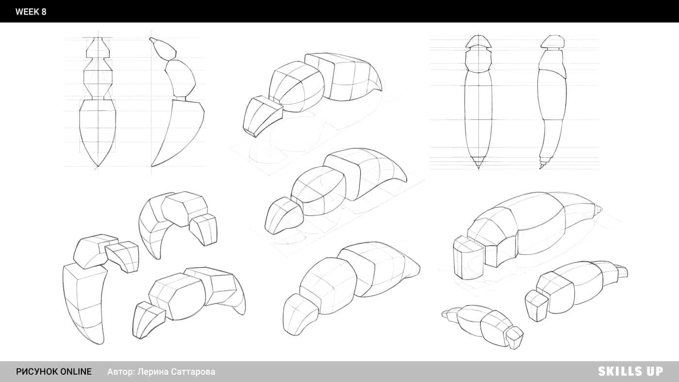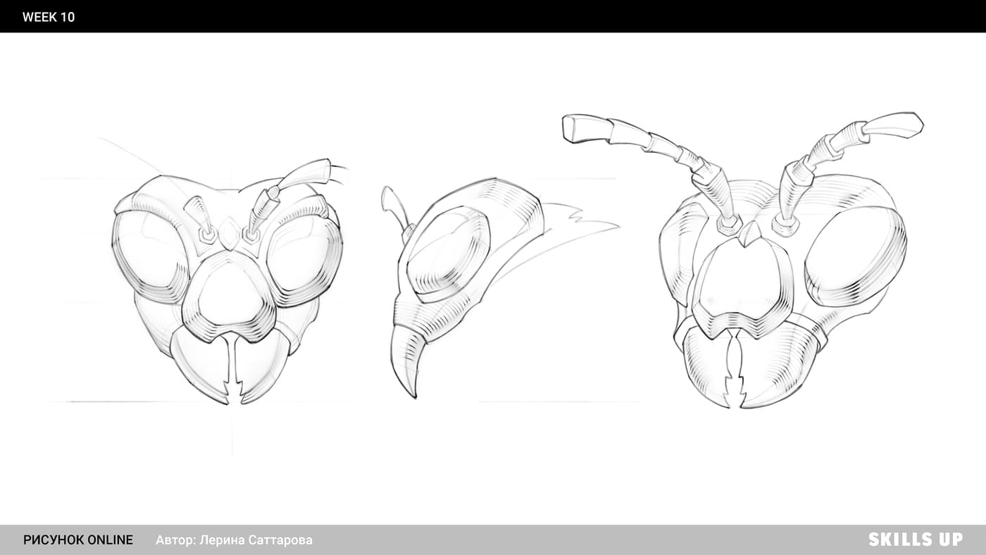 The first part of the course is devoted to industrial design. You will study perspective in detail, learn to masterfully work with chiaroscuro and master the plasticity of inorganic forms. Special attention will be paid to the analysis and creation of complex structures, which will allow you to confidently depict technically complex objects. In the second part of the course, you will immerse yourself in the study of natural forms. Using the example of fish and insects, you will master the basics of composition, learn to convey volume, silhouette and movement, as well as work with a variety of textures and surfaces. This will allow you to create lively and dynamic images that reflect the beauty and diversity of nature.